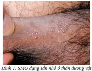 - Nổi mụn vùng sinh dục: ở vùng mu, gốc dương vật, thân hoặc đầu dương vật. Hoặc ở các vùng tiếp xúc khác như hậu môn, miệng,… Mụn có đặc điềm như sau: ban đầu là những mụn nhỏ li ti, sau có xu hướng tăng dần về kích thước, số lượng và tạo thành hình ảnh giống “súp lơ”.